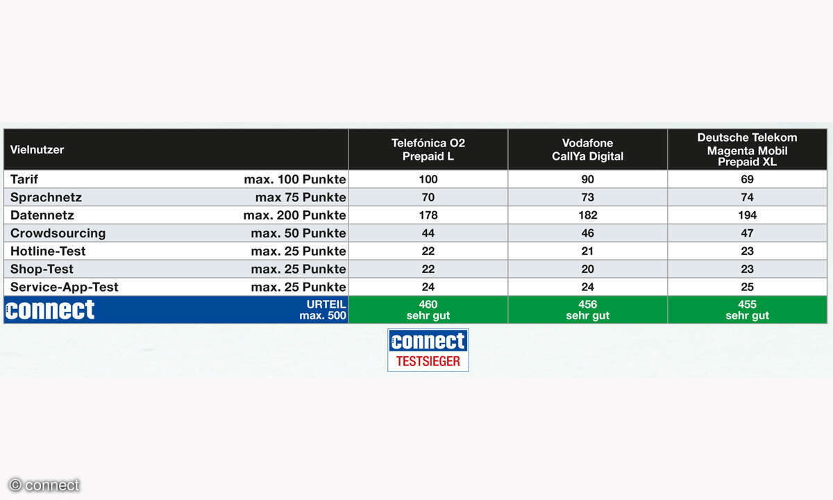Der Datenverkehr wurde ebenfalls im letzten connect-Netztest (1/24) gemessen, diese Ergebnisse flossen in die Bewertung ein. Dabei errang die Telekom zum zwölften Mal in Folge vor Vodafone und Telefónica den ersten Platz und erzielte als einziger Netzbetreiber die Note „überragend“. Die beiden Konkurrenten haben „sehr gut“ abgeschnitten.