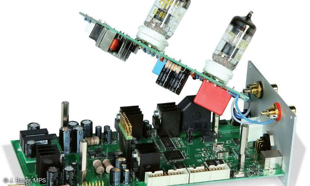 Digital-Dampfer: Vier EC86-Trioden bilden die Ausgangsstufe des Digimaster. Das Mainboard darunter beherbergt unter anderem ein hochmodernes USB-Interface.