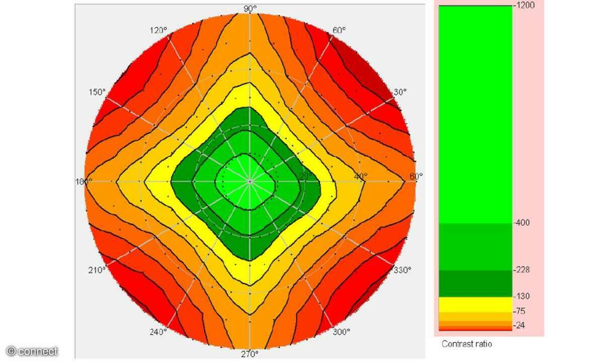 Bei frontaler Draufsicht bietet das mit maximal 432 cd/m2 sehr helle 5-Zoll-Full-HD-Display des Xperia Z1 gute Kontrastwerte mit sehr guter Schärfe. Bei seitlicher Betrachtung zeigt der Screen jedoch Schwächen: Wie auf dem Kontrastdiagramm unten zu sehen, leidet die Bildqualität bei schräger Sicht (rote Bereiche).