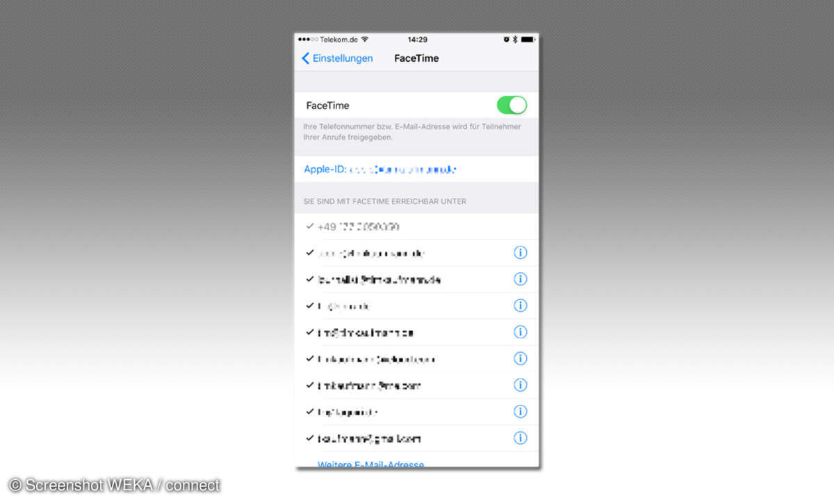 Genauso wie iMessages können Sie auch FaceTime mit Ihrer Apple-ID nutzen. Auch hier lässt sich konfigurieren, unter welchen Nummern beziehungsweise E-Mail-Adressen Sie erreichbar sind. Hinterlegen Sie die Apple-ID auf mehreren Geräten, klingeln alle gleichzeitig, wenn ein Anruf eingeht.