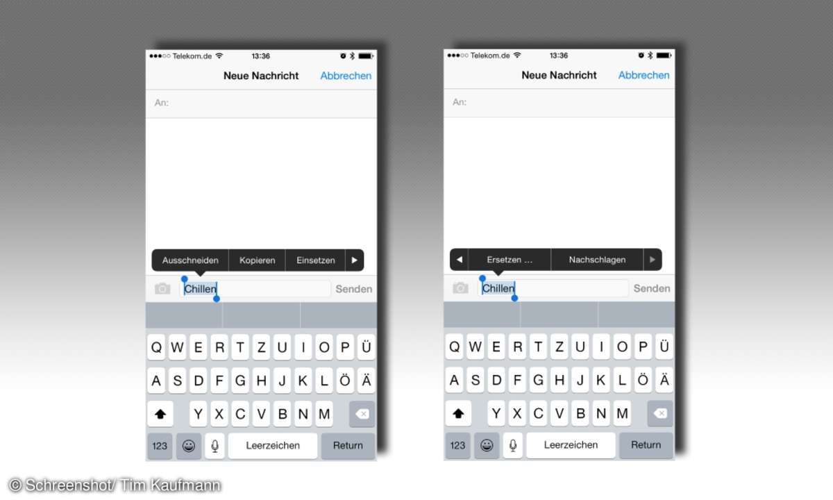 Alternativ tippen Sie den Begriff doppelt an und wählen einen der anderen Vorschläge aus. Je nach Eingabemodus erscheint beim Antippen zunächst die Leiste, wie auf den obigen Bildern dargestellt. Hier tippen Sie auf die Pfeilspitze ganz rechts und dann auf “Ersetzen”.
