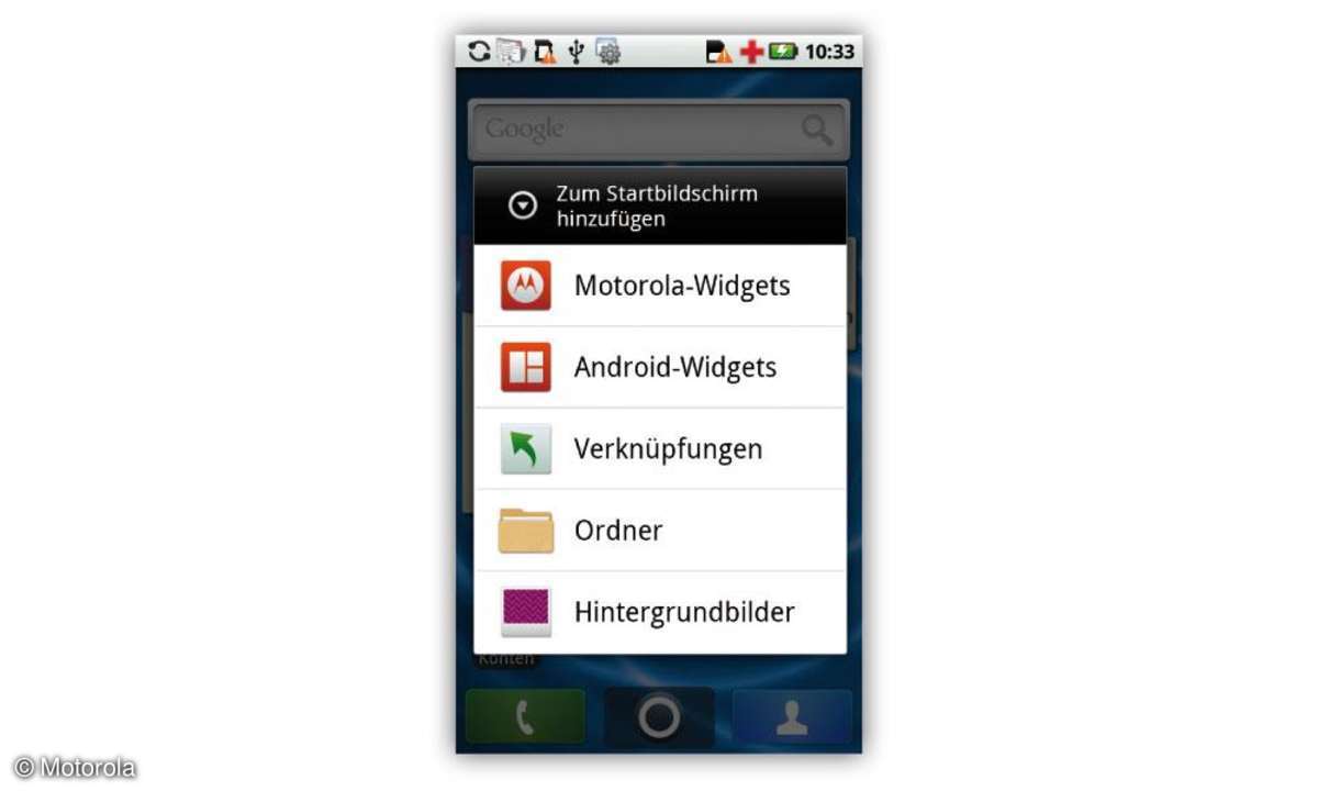 Der Homescreen des Defy bietet gleich sieben Ebenen, die sich individuell mit Widgets und Ordnertn bestücken lassen.