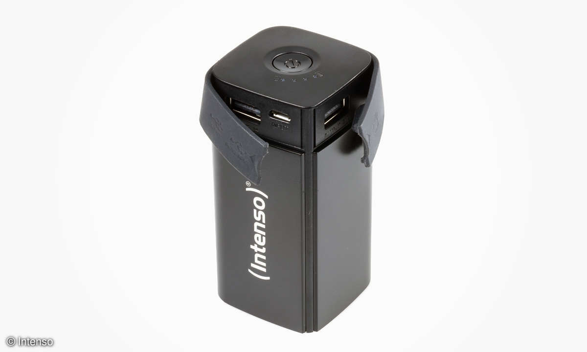 Anders als die Masse verpackt Intenso bei seiner 22 Euro teuren Powerbank die Zellen nicht in ein flaches, sondern in ein würfelförmiges Gehäuse, das in der Praxis kompakter ist als es auf dem Foto scheint. Tatsächlich passt der irgendwie sympathisch gestaltete Intenso gerade so auf eine Handfläche. Mit immerhin 8,4 Amperstunden nutzbarer Kapazität lässt die 10400er Powerbank auch nichts anbrennen. Ein nettes Gimmick sind zudem die Abdeckungen über den Anschlüssen. Am Ende vermerken wir ein solides „Gut“ im Testprotokoll.