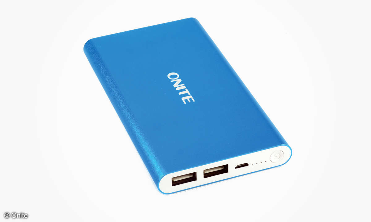 Wäre die Onite nicht blau eloxiert sondern silbern, würde sie als eineiiger Zwilling der JETech durchgehen. So müssen wir schon Messinstrumente auffahren, um festzustellen, dass die Onite zwei Millimeter breiter baut als die JETech. Länge und Höhe sind identisch. Auch anschlussseitig ähneln sich die beiden enorm, wobei die JETech noch eine Taschenlampenfunktion via LED mitbringt. In Sachen nutzbarer Kapazität verliert die Onite 800 Milliamperestunden, entsprechend rund 10 Prozent, auf die JETech. Dieser Umstand und die Tatsache, dass die Onite mit 16 Euro nur unwesentlich günstiger ist, verhindern am Ende das Testergebnis „sehr gut“.