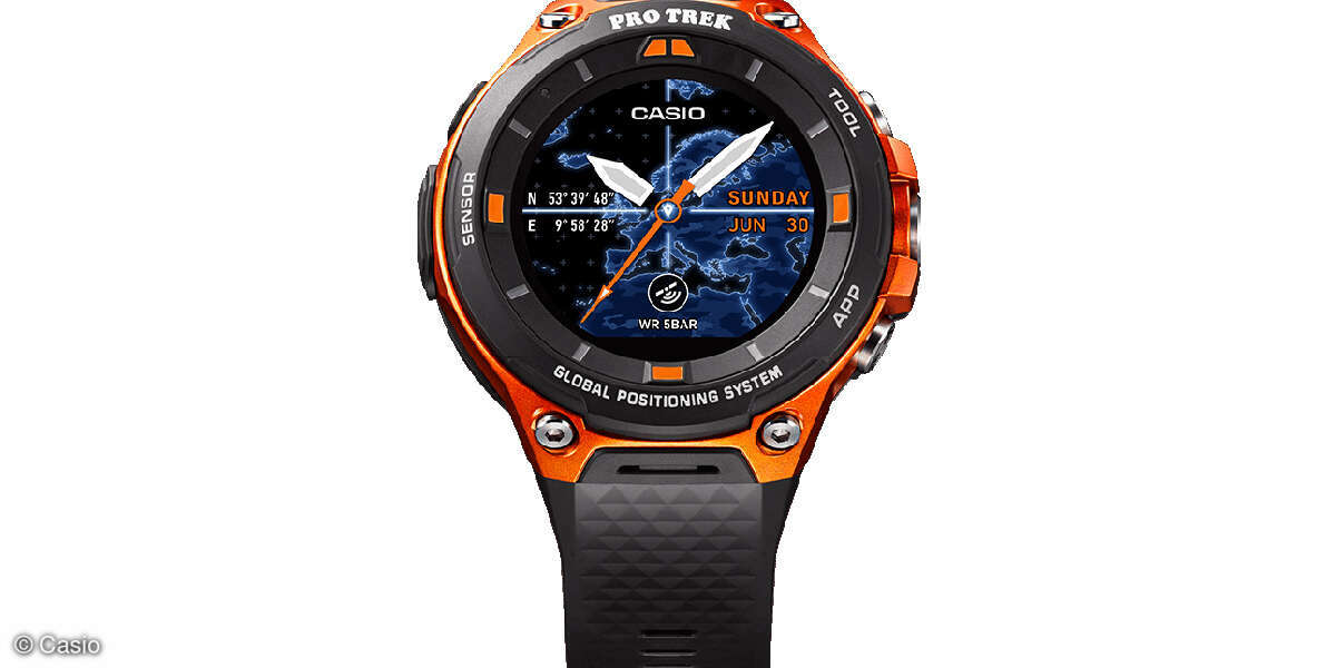 Zum HerstellerDie WSD-F20 (rund 500 Euro) mit Android Wear 2.0 positioniert Casio als „Outdoor-Smartwatch“. Dazu steckt sie nicht nur in einem robusten und kratzfesten sowie wasserdichten Gehäuse (bis 50 Meter), sondern bringt auch einen GPS-Sensor mit und kann den aktuellen Standort in einer Landkarte anzeigen. Clou ist das zweischichtige Display: Im Sperrmodus zeigt die Casio die Uhrzeit einfarbig an. Eingeschaltet wechselt sie dann auf ein Farb-LCD-Display.
