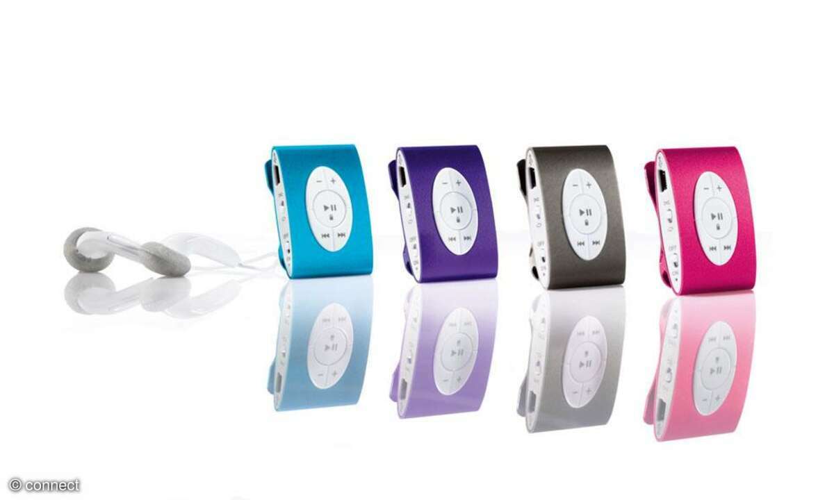 Dieser exklusiv für Tchibo produzierte MP3-Player muss nach Vorbild des iPod shuffle ohne Display auskommen und fällt dafür winzig und 18 Gramm leicht aus. In der Verpackung finden sich ein Stereo-Headset und ein Ladegerät samt USB-Kabel, mit dem wir im Test problemlos, wenn auch nicht besonders flott, zwei MP3-Alben auf den Player geladen haben. 4 GB an Speicher stehen insgesamt zur Verfügung. Zum Vergleich: Der iPod Shuffle kostet mit 2 GB rund 50 Euro, hier gibt's das doppelte für den halben Preis. Dafür ist der Klang des Headsets nicht besonders, die Steuerungstasten wackeln ein wenig und im Test sind wir mit der Start-/Pause-/Sperrtaste noch nicht so gut klargekommen. Angesichts des Preises muss man damit dann wohl einfach leben.