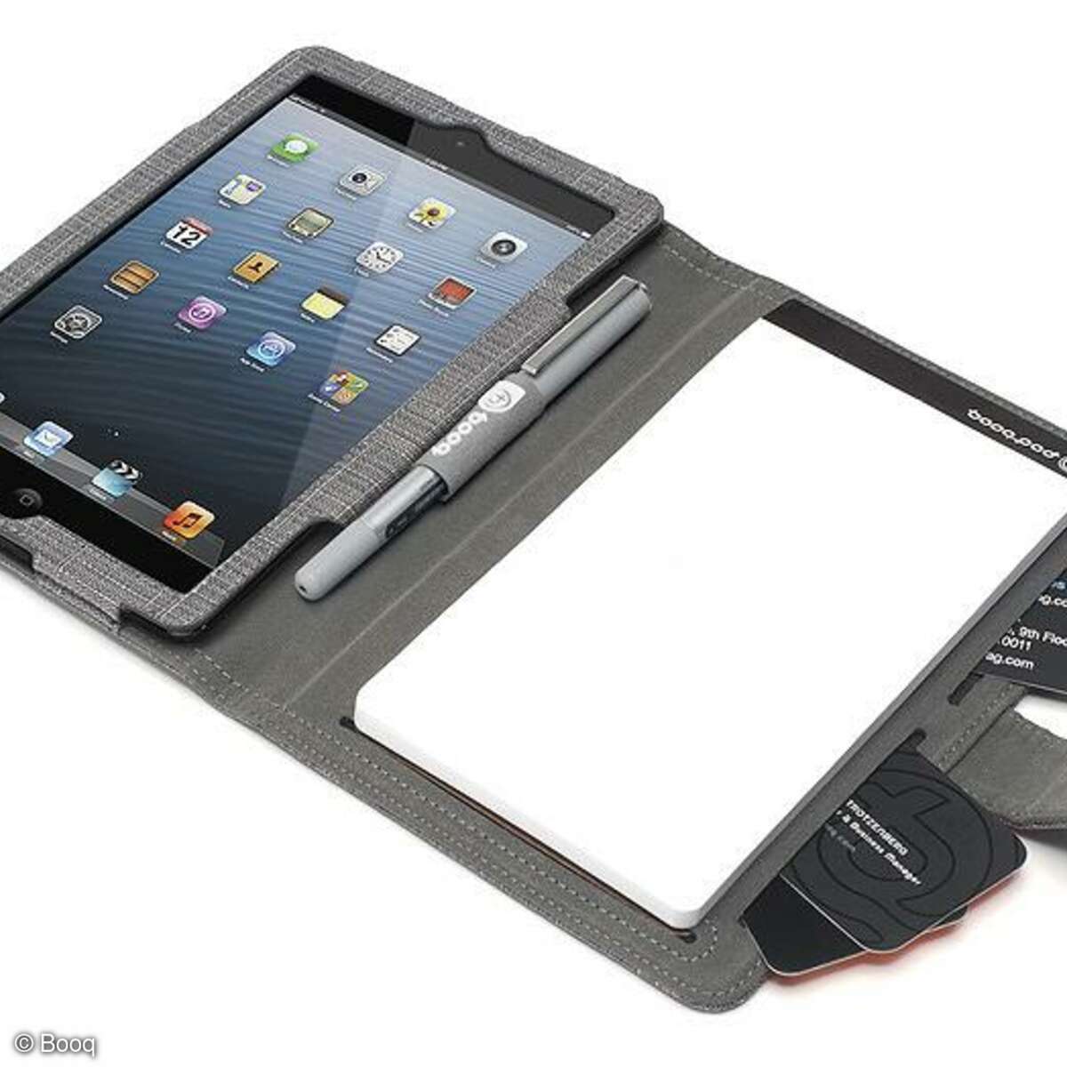 Wer stilistisch auf Nummer sicher gehen will, kann zu den neuen Taschen von Booq greifen, etwa zum Booqpad. Da passt viel rein: iPad, Block, Visitenkarten, Tickets und sogar Bargeld. Das alles findet in einer hübschen Hülle Platz, die sich wie ein Notizbuch zuklappen lässt. Zu haben für 49,95 Euro in Naturfaser (grau) oder Kunstleder (schwarz).