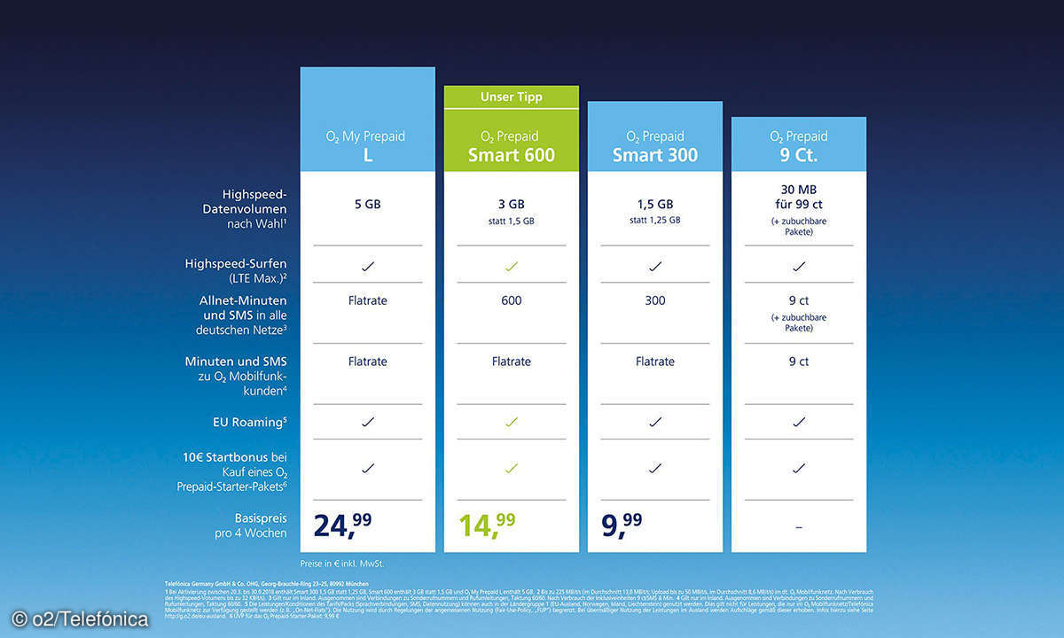 Im Prepaid Tarif Smart 300 gab es bisher 1,25 GB Datenvolumen. Ab dem 20. März wird es aufgestockt auf 1,5 GB Datenvolumen. Der Preis für den Tarif liegt bei 9,99 Euro für eine Laufzeit von vier Wochen. Mit im Tarif sind außerdem 300 Freiminuten und eine SMS-Flat in alle deutschen Netze sowie eine Flatrate für Anrufe und SMS an andere Kunden aus dem o2-Netz.