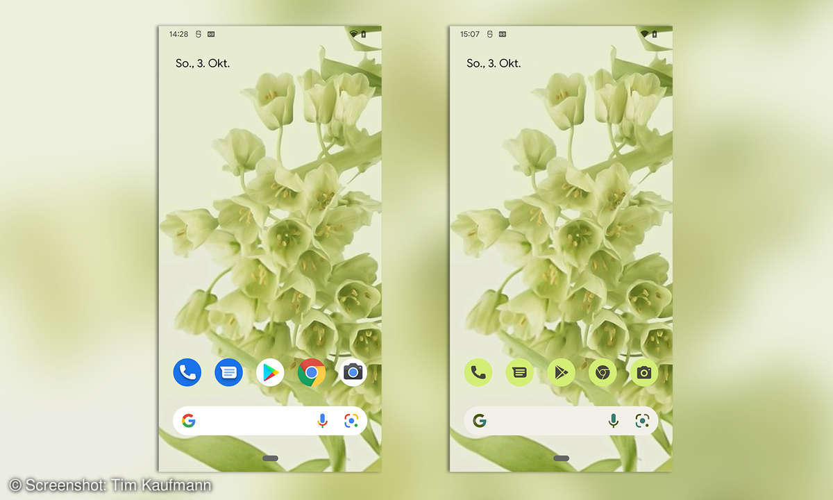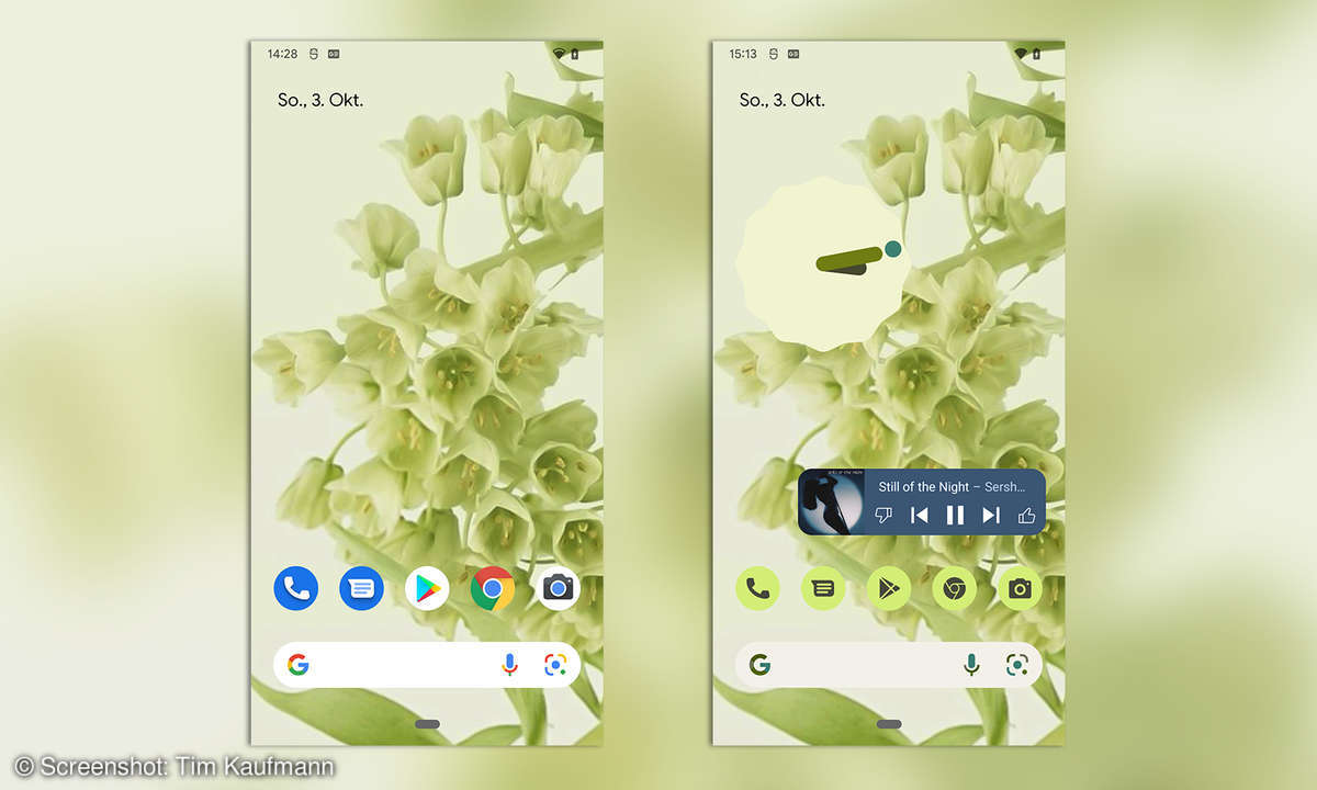 Eine entscheidender Bestandteil von Material You ist die neue Funktion "Farbextraktion". Sie generiert eine zum Hintergrundbild passende Farbpalette und färbt die Android-Benutzeroberfläche passend ein. Gut zu sehen ist das im Beispiel, in dem das Grün der Pflanzen sich in den Knöpfen in den Schnelleinstellungen widerspiegelt. Nicht immer ist der Effekt derart auffällig. Beispielsweise verpasst Android 12 auch dem früher reinweißen Hintergrund der Einstellungen einen ganz leichten Farbstich, in unserem Beispiel ebenfalls grün.