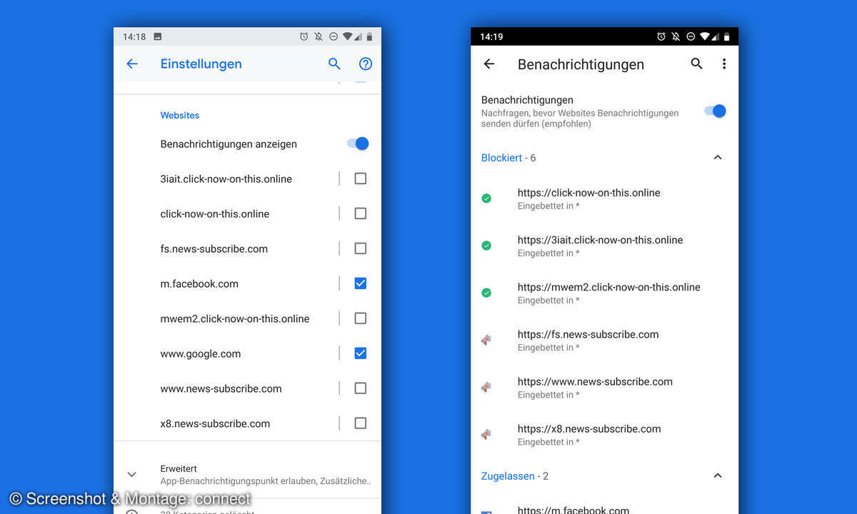 Benachrichtigungen in Android sind ein wichtiges und nützliches Feature. Doch immer wieder wird die System-Funktion für unerwünschte Werbung missbraucht. Viele Nutzer vermuten dann, ein Virus hätte das Smartphone befallen. Doch häufig ist die Ursache eine andere: Ein unachtsamer Click im Browser wie Chrome oder Firefox genügt und Sie haben sich den Benachrichtigungs-Spam durch ein Push-Abo selbst eingefangen. Wir erklären, wie die Spam-Falle funktioniert und wie Sie die nervigen Benachrichtigungen wieder deaktivieren.