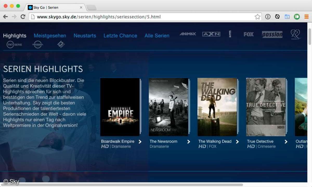 Filme, TV-Serien und Dokumentationen aus dem aktuellen Sky-TV-Programm erreichen Sie über die Mediathek. Das Angebot ist so umfangreich, dass man eigentlich immer Zerstreuung findet. US-Serien bringt Sky Go häufig kurz nach der Premiere im Original-Ton. Aber nicht alles, was es im Sky-Fernsehen gab, finden Sie auch in der Mediathek. Hinzu kommt: Sky Go muss Inhalte wieder aus der Mediathek entfernen, wenn die Sendelizenz abgelaufen ist. Ewig Zeit lassen mit dem "Zeitversetzt sehen" können Sie sich also auch hier nicht.