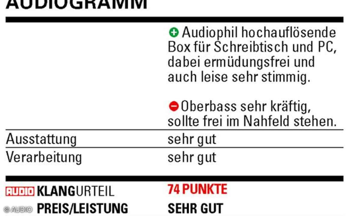 In punkto Raum zog sie knapp an der Focal CMS 40 vorbei, die dafür aber bei höheren Pegeln den besseren Überblick behielt. Doch am meisten überzeugte die ARTist 3 ohnehin leise: Selbst flüsternd behielt sie Natürlichkeit und Transparenz bei, und für den Schreibtischeinsatz sind ihre Reserven mehr als ausreichend.