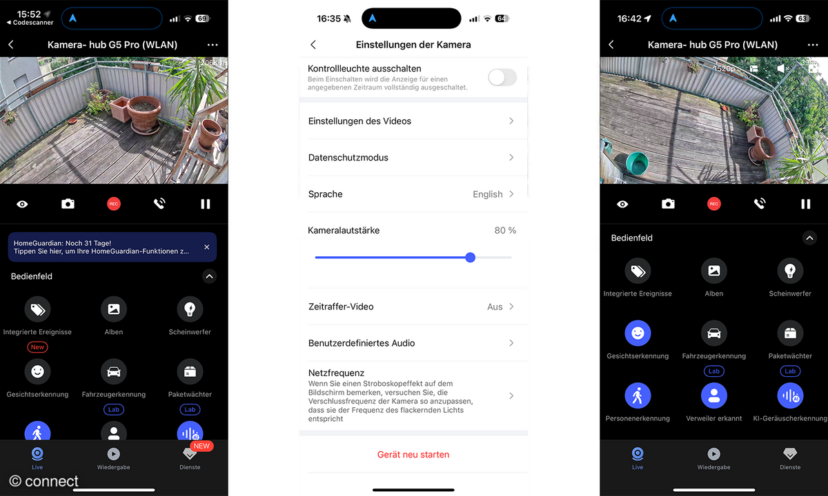 Ungebetene Besucher kann je nach Vorgabe in der App eine durchdringende 100-Dezibel-Sirene vertreiben. Auch Gegensprechen zwischen App und Kamera ist möglich. Eine clevere Funktion ist zudem, dass die Kamera algorithmisch erkennt, wenn ihre Linse verdreckt ist und per App-Meldung auf diesen Zustand hinweist. Dass in der App einige wenige Beschriftungen in Mandarin-Chinesisch stehengeblieben sind, ist eine eher kosmetische Einschränkung, die vielleicht mit einem der nächsten App-Updates verschwindet.