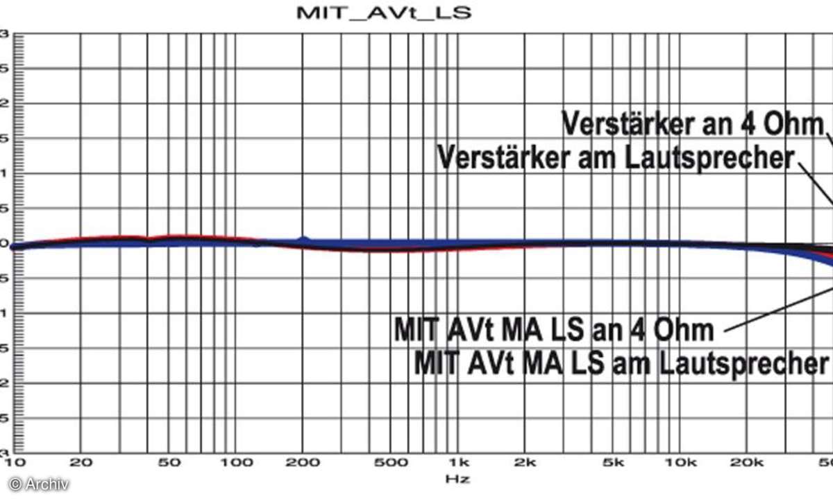 Erfreulich gering ist auch der Einfluss des MIT-Lautsprecherkabels: Im Hörbereich ist praktisch kein Unterschied zur direkt am Verstärker erfolgten Messung feststellbar. Ob sich die leichte Filterwirkung der MIT-Kabel positiv auf den Klang auswirkt, kann nur ein einziges "Mess"-Instrument klären: das Gehör!