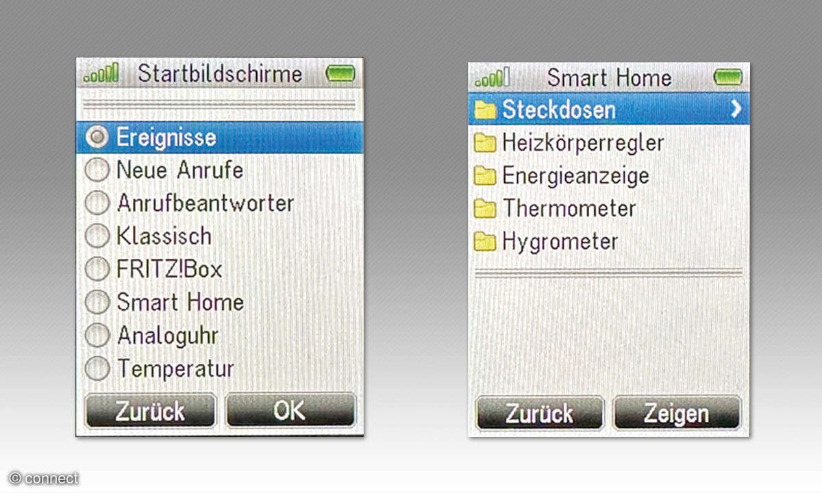 Der Startbildschirm des X6 lässt sich zwischen verschiedenen Anzeigetypen umschalten – die Auswahl reicht von Statusinfos zur aktuellen Internetverbindung der Fritz!Box über Smarthome- und Anrufbeantworteranzeigen bis zur Wettervorhersage. Zudem bietet das Telefon drei einstellbare Weckrufe, einen Timer, einen Terminkalender und eine Babyfon-Funktion.
