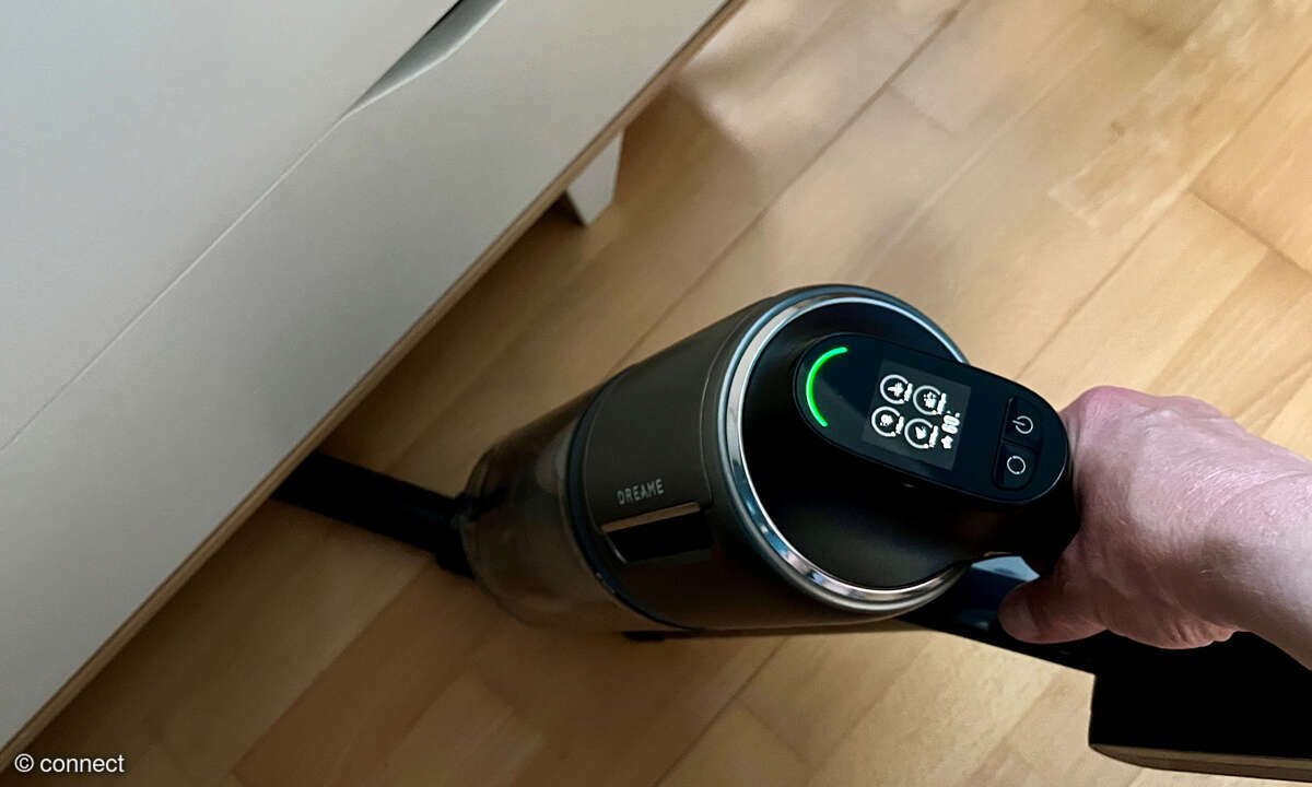 Beide Bodenbürsten sind wendig und leicht zu führen. Allerdings kann man den Sauger mit keiner von beiden komplett flach auf den Boden legen, um ihn etwa unter das Doppelbett zu schieben. Dafür liefert Dreame ein knickbares Zwischenstück mit, mit dem sich der untere Teil um bis zu 90 Grad abwinkeln lässt. Dreame empfiehlt den Einsatz nur für Unter-Möbel-Missionen und das Teil ansonsten wieder abzunehmen, um von der vollen Saugleistung zu profitieren. Zudem sitzt der Griff mit Aufsatz sehr hoch, was für kleinere Menschen auf Dauer nicht ergonomisch ist. In die Mitte eines 1,60-Meter-Betts reicht das Konstrukt trotzdem nicht.