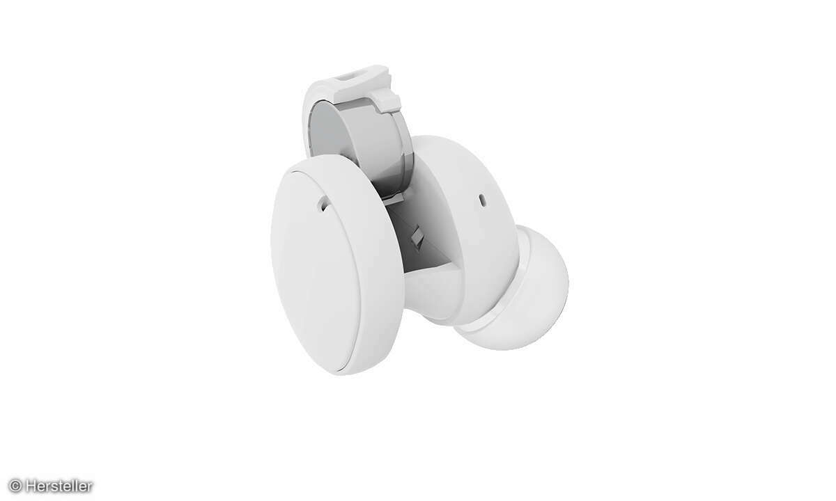 Das Case ist quadratisch und besteht aus mattem Kunststoff, der unempfindlich gegenüber Fingerabdrücken ist und ansonsten so unauffällig, dass er keinen bleibenden Eindruck hinterlässt. Die Seiten sind ergonomisch gerundet, sodass das Kästchen schnell und unauffällig in Hemd- oder Hostentasche verschwindet. Allerdings nicht so unauffällig wie viele andere Wettbewerber. Das Case ist deutlich größer und schwerer als etwa bei den neuen Nothing Ear (a). Ein weiterer Minuspunkt: Das Case kann nur per USB-C und nicht kabellos geladen werden. Das kostet Punkte in unserer Gesamtwertung.