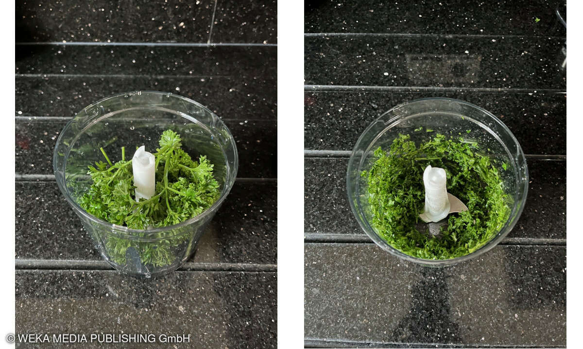 Die Motoreinheit des Stabmixer besitzt eine Leistung von 1.400 Watt und 20 Geschwindigkeitsstufen. Diese lassen sich stufenlos per Drehrad wählen. Für ganz harte Zutaten wie Eiswürfel gibt es außerdem eine Turbotaste, die ganze 15.000 Umdrehungen pro Minute schafft. Wir haben Eiswürfel zerkleinert und auch Kräuter mit dem Multizerkleinerer gehäckselt und waren mit dem Ergebnis sehr zufrieden. Das Aufschäumen von Milch funktionierte mit dem entsprechenden Aufsatz prima, der Milchschaum war fest und stand wie eine eins. Ebenso gut klappte das Pürieren von Kartoffeln sowie Herstellen einer Mayonnaise mit dem Emulgierstab. Auch Sahne lässt sich schlagen, allerdings empfanden wir den Schneebesen etwas zu lang, denn bei Benutzung wackelte dieser u.E. nach etwas zu sehr.
