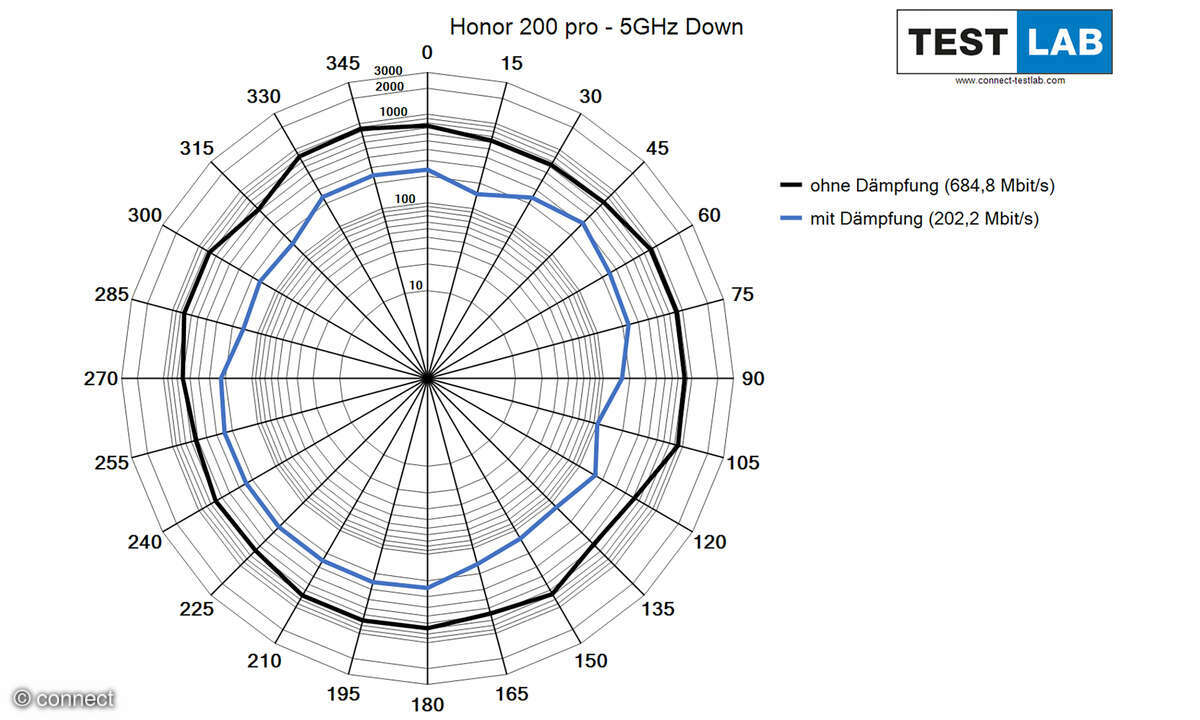 Die Funkeigenschaften setzen das Top-Niveau fort, im 5G-Netz messen wir in allen vier Bändern eine überdurchschnittliche Sendeleistung und eine hohe Empfindlichkeit. Das Honor 200 Pro gehört damit funktechnisch zu den besten 5G-Smartphones auf dem Markt. Im LTE-Netz wird dieses Top-Niveau nicht erreicht. Hier messen wir zudem im Band 7 (2,6 GHz) eine auffällig niedrige Sendeleistung, die im Kontrast zu den ansonsten guten Messergebnissen in den anderen Bändern steht. Wir sind hier in Rücksprache mit dem Hersteller, der an einer Lösung des Problems arbeitet. Die LTE-Einschränkung betrifft einzig die Sendeleistung in Band 7, also den ultraschnellen Upload in dicht besiedelten Zentren. Für die generelle Versorgungsqualität bringt das keine Einschränkungen. Damit werden aber die ansonsten guten Funkeigenschaften in der Gesamtwertung nach unten gezogen.