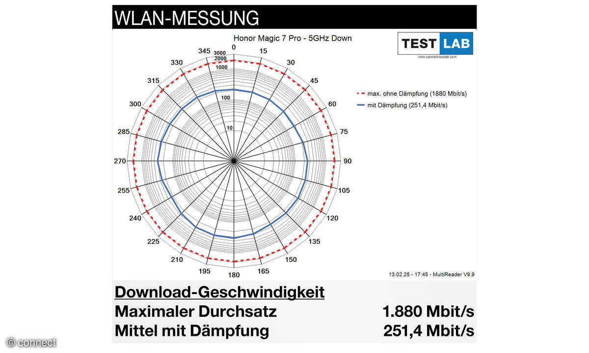 Die im Testlabor gemessenen WLAN-Datenraten des Magic 7 Pro sind ausgezeichnet. Mit einer maximalen Übertragungsrate von 1.880 Mbit/s übertrifft es viele Top-Smartphones deutlich. Zum Vergleich: Das S24 Ultra erreicht 1.520 Mbit/s. Bei schwacher Verbindung zeigt sich noch Verbesserungspotenzial. Hier fällt der Durchsatz auf 251 Mbit/s, während die Konkurrenz etwas besser abschneidet.