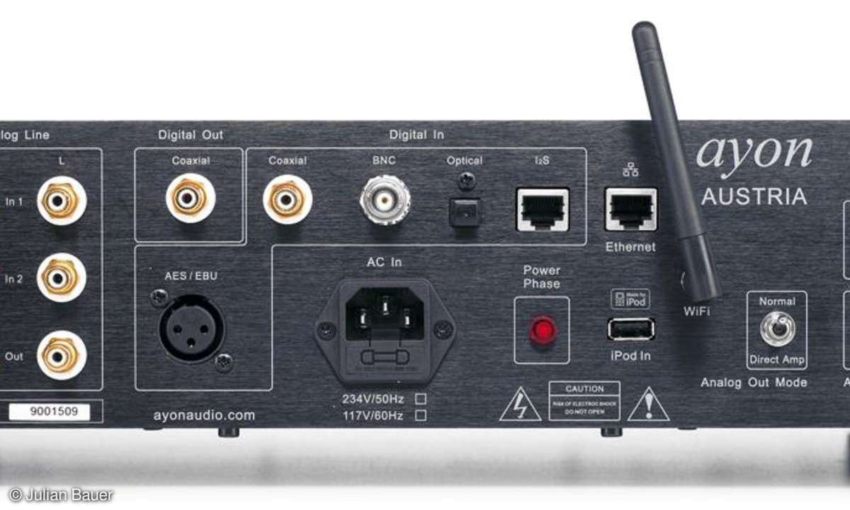 Mit sieben Eingängen von AES/EBU über I2S bis hin zu USB kommen auch beim D/A-Wandler keine Anschlussnöte auf. Die rückseitige USB-A-Buchse, als Host-Schnittstelle angelegt, erlaubt den digitalen Anschluss eines iPod, der sich hernach auch über die Benutzeroberfläche des Ayon steuern lässt. Der frontseitige USB-A-Anschluss hingegen dient zur Wiedergabe von Musik auf Speichermedien wie USB-Sticks oder Festplatten.
