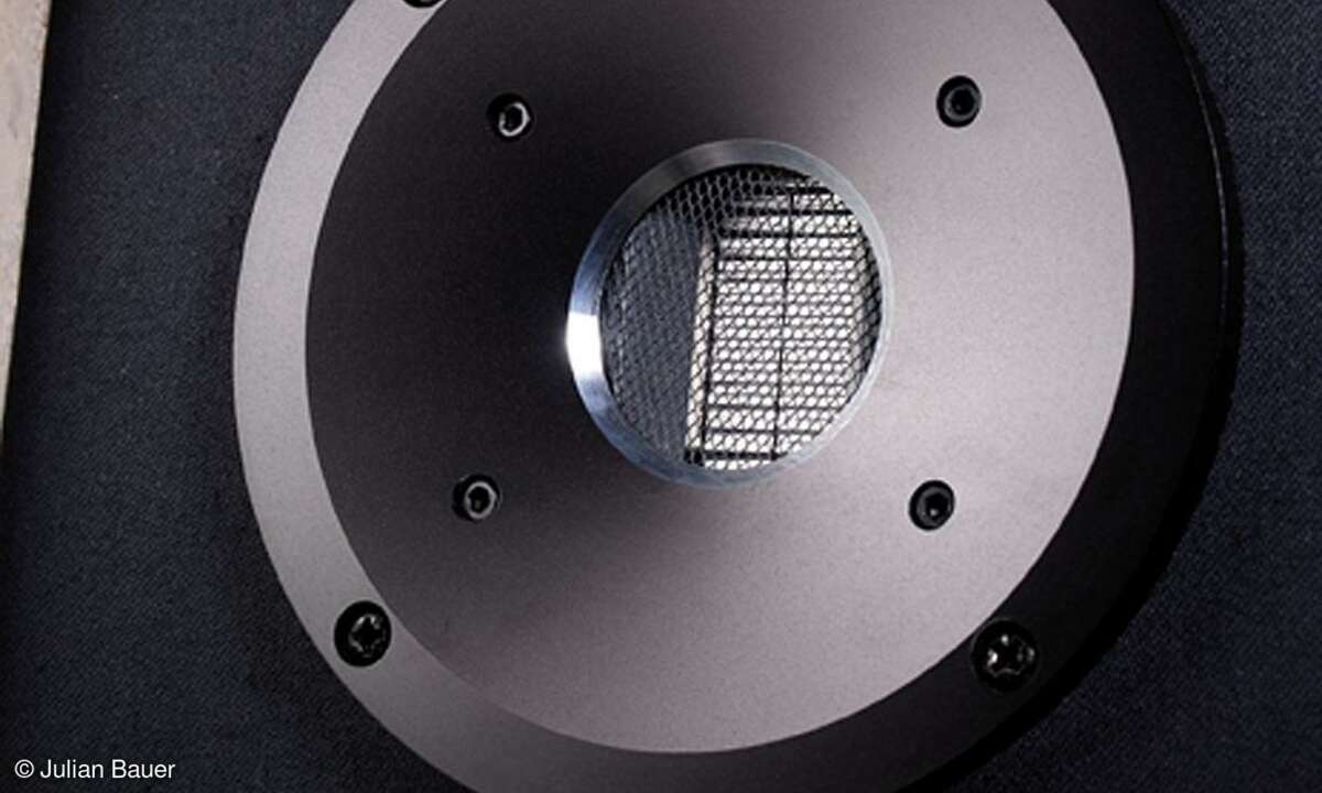 Der besondere Reiz des mit einem Übertrager ausgestatteten Systems - er hebt die Impedanz auf verstärkerfreundliche Werte - ist die geringe bewegte Masse seiner signaldurchflossenen Membran: ganze 6 Milligramm, Faktor 5 bis 10 weniger als bei den gängigen Kalottenhochtönern. Unterhalb der für ein Bändchen recht tiefen Übergangsfrequenz von 2700 Hertz agiert ein konventioneller Konustreiber mit stabilem Gusskorb. An Stelle der üblichen mitschwingenden Staubschutzkalotte verfügt er über einen feststehenden Phaseplug in Form einer rundlichen Nase, an deren Übergang zur Membran Luft aus dem Schwingsystem ein- und ausströmt, was der Wärmeabfuhr zugute kommt und eine Kompression der im Chassis eingeschlossenen Luft verhindert.