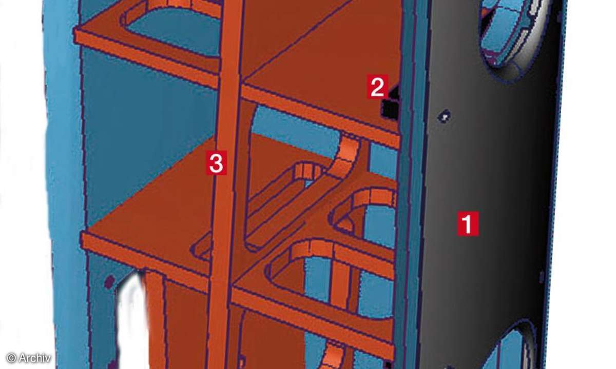 Doch selbst dieser Konstruktion unterstellt Perfektionist Wolf zu große Nachgiebigkeit, weshalb er die (leicht gewölbte) Front aus einem massiven Stück Aluminium fräsen lässt. Da sitzen die eingeschraubten Treiber auch nach Jahren noch bombenfest.