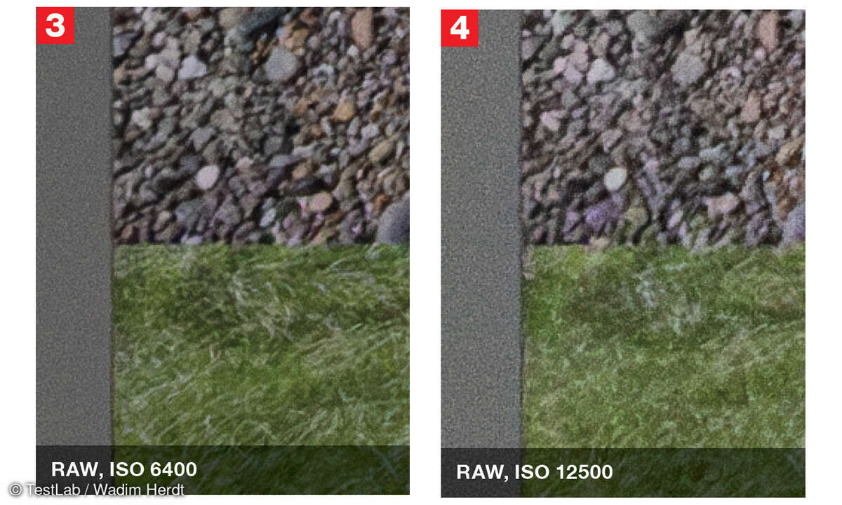 Das RAW-Format liefert bei gleicher Empfindlichkeit weit bessere Bildqualität (2). Bei ISO 6400 (3) ist die RAW-Aufnahme detailärmer, aber immer noch dem ISO-3200-JPEG eindeutig überlegen. Auch bei ISO 12500 liegt der Vorteil auf RAW-Seite (4), wenn auch nun die Unterschiede kleiner werden. Das feinkörnigere RAW-Rauschen bei ISO 12500 (4) ist visuell oft wenig störend.