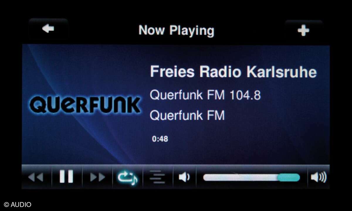 Wer im Wohnzimmer eine Touch betreibt, könnte auf dem Nachttisch oder in der Küche ein Squeezebox Radio platzieren und müsste sich beim Bedienen dank eng verwandter Menüstruktur kaum umgewöhnen. Der Sechs-Zentimeter-TFT-Schirm dient hier zwar nur der Anzeige und nicht der Steuerung, ist aber ebenfalls farbig und verblüffend hochauflösend. Von der anderen Zimmerecke aus ablesbar ist er freilich nicht, und daher ist es auch verzeihlich,dass dem Radio keine Fernbedienung beiliegt - in der typischen Hörsituation steht das niedliche, nur etwa 20 Zentimeter breite Teil ohnehin in Griffweite.Konsequent hat Logitech / Slim Devices dem Radio genau das verwehrt, was man anhand des Namens vielleicht erwarten würde, nämlich analoges FM-Radio.