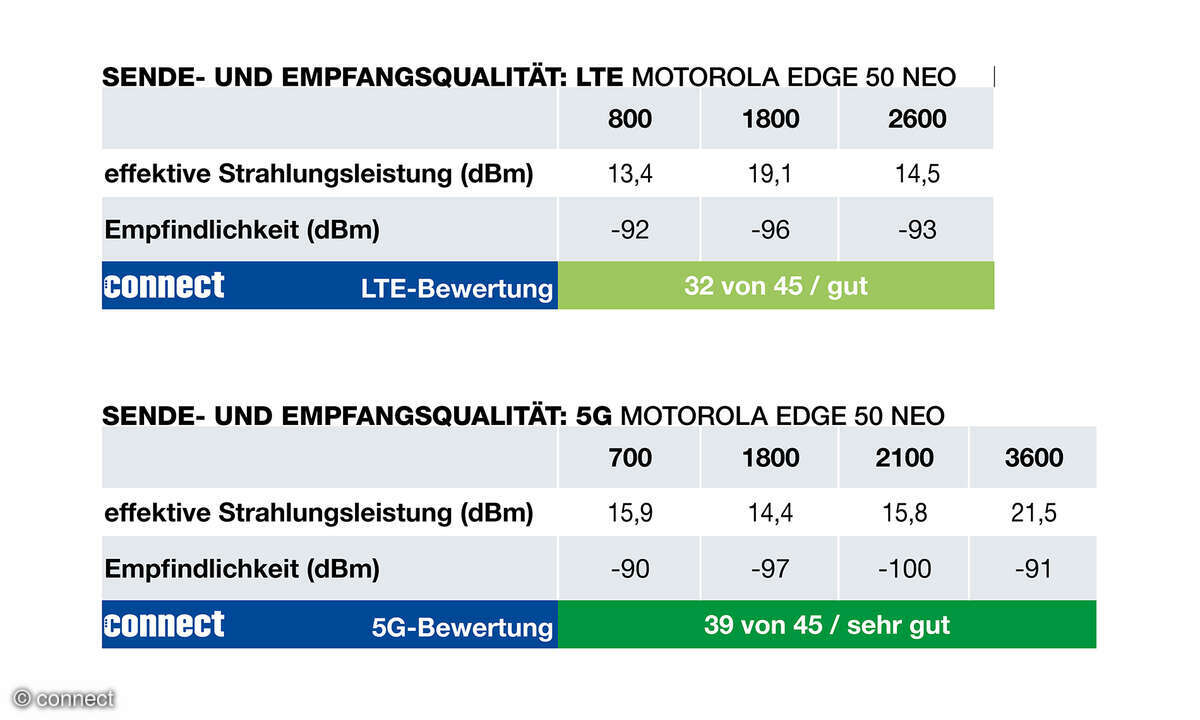 Beim Edge 50 Neo hat Motorola den Empfang deutlich verbessert: Während der LTE-Empfang nun gut abschneidet, erreicht der 5G-Empfang sogar eine sehr gute Wertung. Eine klare Steigerung im Vergleich zum Vorgänger, der in beiden Standards befriedigend abgeschnitten hatte.
