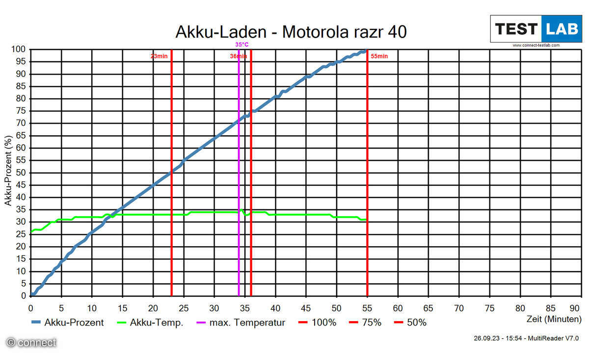 Die neuen Falter bieten aufgrund der kompakten Bauform nicht viel Platz für den Akku und daher sind auch keine überragenden Laufzeiten zu erwarten. Das Razr 40 tanzt hier im positiven Sinne aus der Reihe, denn mit 11:26 Stunden in unserem genormten Laufzeittest werden sowohl das Schwestermodell Razr 40 Ultra (10:04 Stunden) als auch das Galaxy Z Flip 5 (10:33 Stunden) klar übertrumpft. Durch den Tag kommt man mit dem Razr 40 also auch bei intensiver Nutzung ohne Probleme.