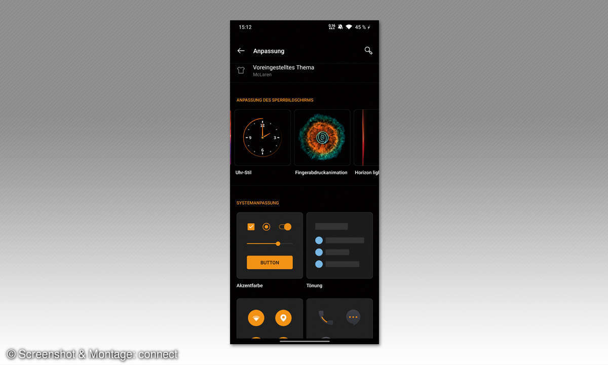 Akzentlinien um Kamera und Gehäuserand in der McLaren-Farbe „Papaya Orange“ geben dem Gerät ein dem Motto entsprechendes Auftreten. Auch die Benutzeroberfläche folgt dem Stil mit einem dunklen McLaren-Theme mit orangefarbenen Akzenten und extra angepassten Icons.