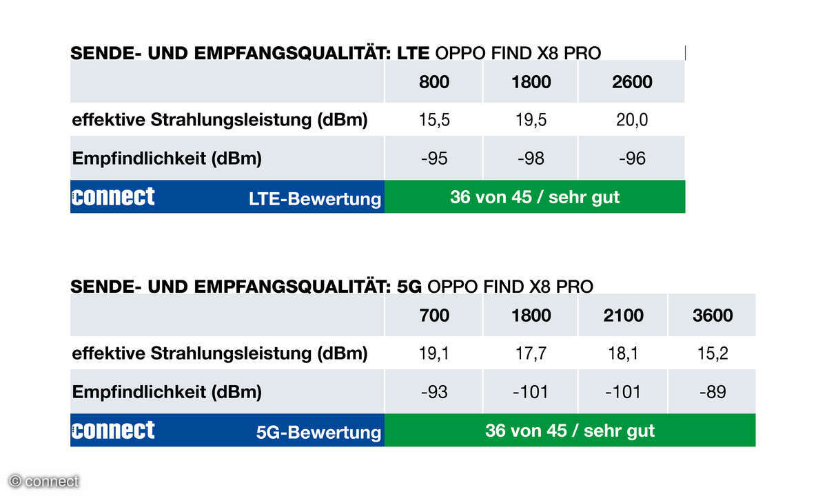 Die Empfangsmessungen waren etwas turbulent. Zuerst hatten wir beim Find X8 Pro eine sehr niedrige Sendeleistung auf allen Bändern gemessen. Per Software-Update konnte Oppo den Umstand jedoch beheben. Eine Nachmessung ergab sowohl bei LTE als auch bei 5G exzellente Sendeleistungen über alle Bänder. Dadurch erreicht das Find X8 Pro nun einen durchweg sehr guten Empfang!
