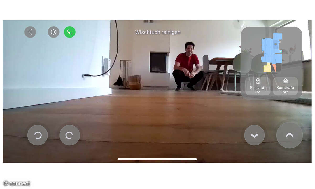 Ebenfalls gesetzt in der Oberklasse: die ausfahrbare Seitenbürste, die in Ecken und unter Überhängen kehrt. Der rechte Wischmopp tut es ihr gleich und schwenkt gleichfalls nach außen, um schwer erreichbare Stellen besser abzudecken. Das funktioniert nicht immer zu 100 Prozent passgenau, bietet aber einen deutlichen Mehrwert gegenüber Modellen, bei denen die Komponenten fest verbaut sind.
