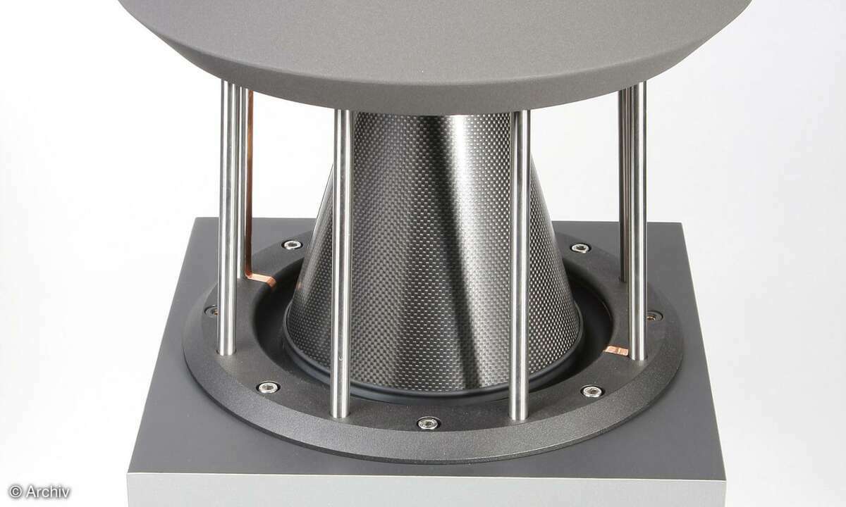 Die Arbeitsweise ist ebenso komplex wie faszinierend: In den unteren Frequenzen agiert der Strahler kolbenförmig, zu höheren Frequenzen hin als Biegewellenschwinger. Durch die Arbeitsteilung und die rundum offene Bauweise wird horizontal mit einem Winkel von 360 Grad abgestrahlt - über den gesamten Hörbereich. Den Antrieb bewerkstelligt wie bei Kolbenstrahlern eine Schwingspule, die im Feld eines Dauermagneten zentriert ist.