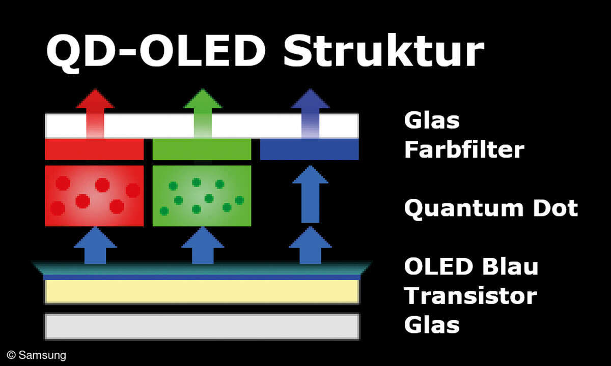 Anders als „klassische“ WRGB-OLEDs besitzt QD-OLED nur farbreine Pixel. Durch Quantum-Dot-Nanokristalle wird das ursprünglich blaue OLED-Licht in die beiden anderen Grundfarben umgewandelt. Dies soll besonders effizient sein und minimiert den Aufwand in der Panelstruktur. Tatsächlich sind Farbvolumen und Blickwinkel messbar besser als bei OLED-TVs mit anderen Displays. Bei der S95-Serie maximiert Samsung dann noch die Leuchtkraft.