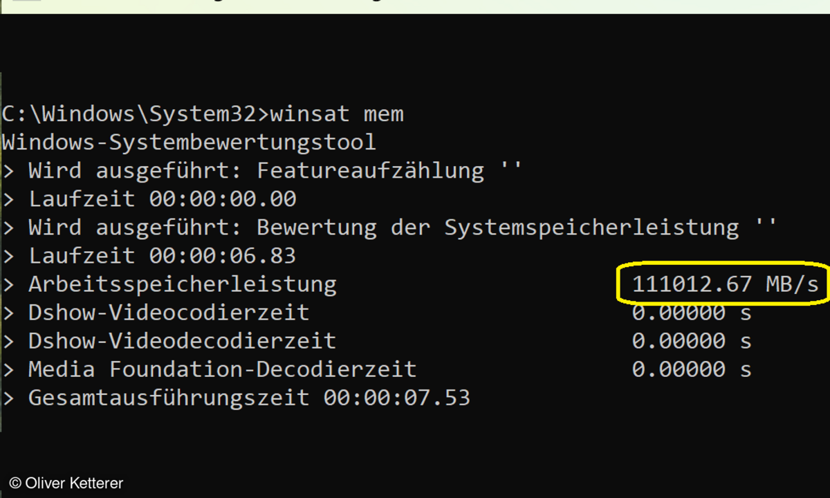 In einem unserer weiteren Test zeigt das RAM-Kit erneut enorm hohe Leistungsbereitschaft. Startet man die Console in Windows direkt im RAM und frägt dann die Speicherleistung ab, dann ist diese natürlich besonders hoch, da die wenigsten Hardware-Komponenten involviert sind. Hier erreichen wir ein Testergebnis von 111 GByte/s – beeindruckend.