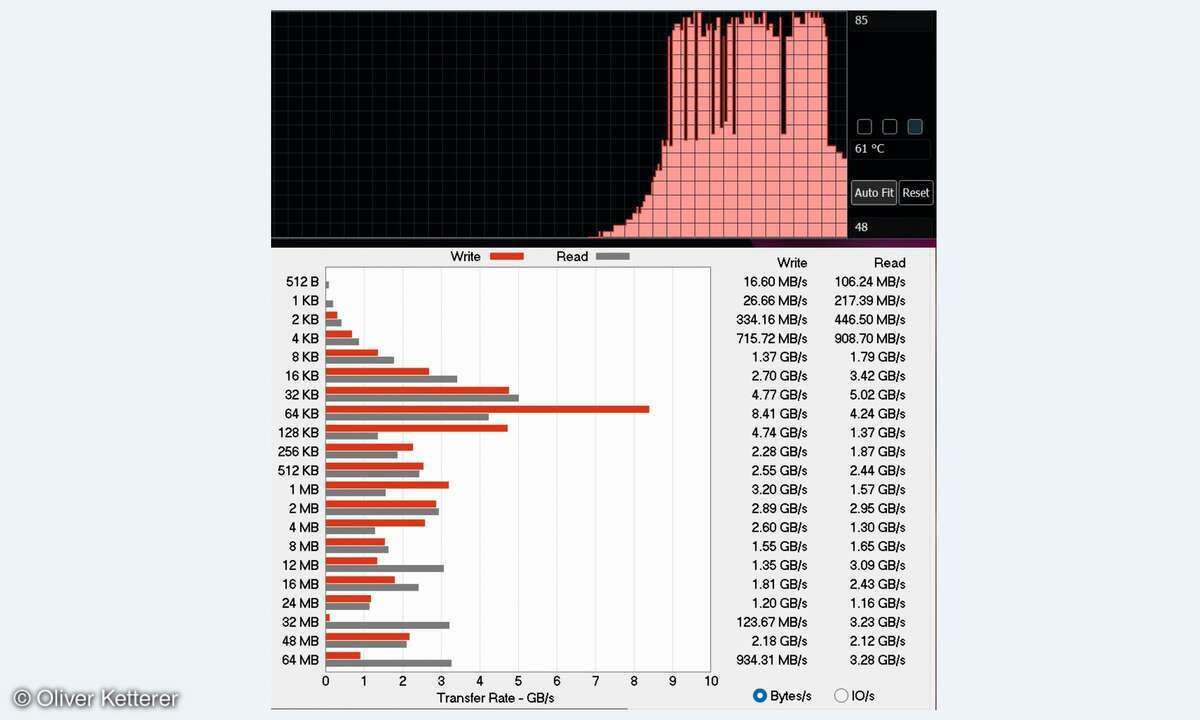 Interessant und nicht gerade schmeichelhaft ist, dass sich Thermal Throttling mit einem passiven Kühlkörper bei aktivem Gehäuselüfter – mit Luftstrahl auf die SSD – und intensiver Belastung nicht gänzlich ausmerzen ließ. Immerhin konnten wir mit einem sehr günstigen Passivkühler – unter 10 Euro – von ICY Box bei aktiver Gehäusekühlung eine gute Kühlung erreichen. Dies erlaubte Lese- und Schreibraten von mehr als 12 beziehungsweise 10 GByte/s, wenn die die Temperatur nicht zu hoch wurde. Mehr als 80 °C, gemessen mit den eingebauten Thermalsensoren, sind für die T-Force Z540 aber zu hoch und lösen die Kühlungsbremse aus.
