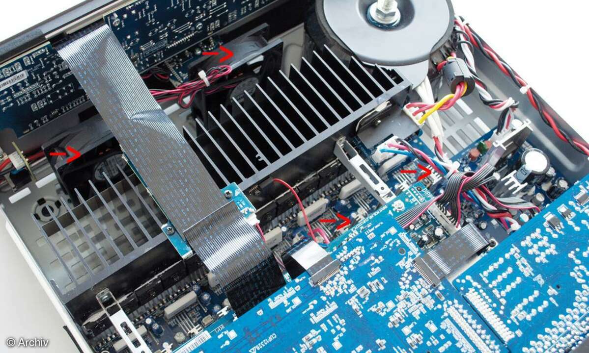 Das war's dann aber schon mit der Sparsamkeit. Bei den Ausgangstransistoren setzte Arcam wieder auf kernige 200-Watt-Typen von On Semiconductor, die dank eingebauter Sensor-Dioden schnell auf Wärmeänderungen reagieren können. Etwaige Überhitze blasen zwei vor dem massiven Endstufen-Kühlprofil aufgestellte Notfall-Ventilatoren weg.