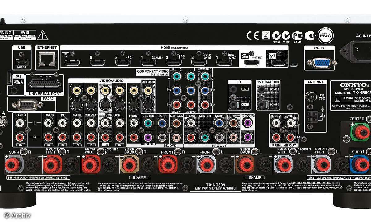 De facto wird er sich vorher dem Videobereich zuwenden, den Onkyo im Vergleich zu Vorgängern kräftig modernisiert hat. Es gibt wieder Ein- und Ausgänge in Hülle und Fülle. Klassische für ein-, zwei- und dreikomponentiges Analogvideo (kurz V, S-V und 3K). Plus eine Multikontakt-RGB-Videobuchse für Laptops als Extra. Hinzu kommen neben zwei Outs nicht weniger als acht HDMI-Ins - sieben hinten und einer auf der Front. So viele, dass der Fan etwa Phono mit HDMI paaren und den Eingang - je nachdem, was anliegt - für zwei Quellen aufteilen kann.
