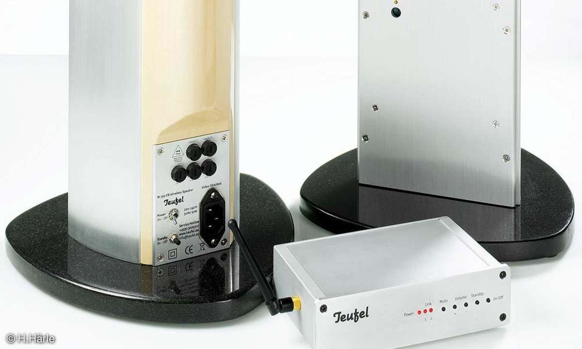 Lautsprecherhersteller Teufel verspricht ein vollwertiges Heimkino-System, in dem die Standboxen mit Funkübertragung und Batteriebetrieb arbeiten, ganz ohne Kabel.