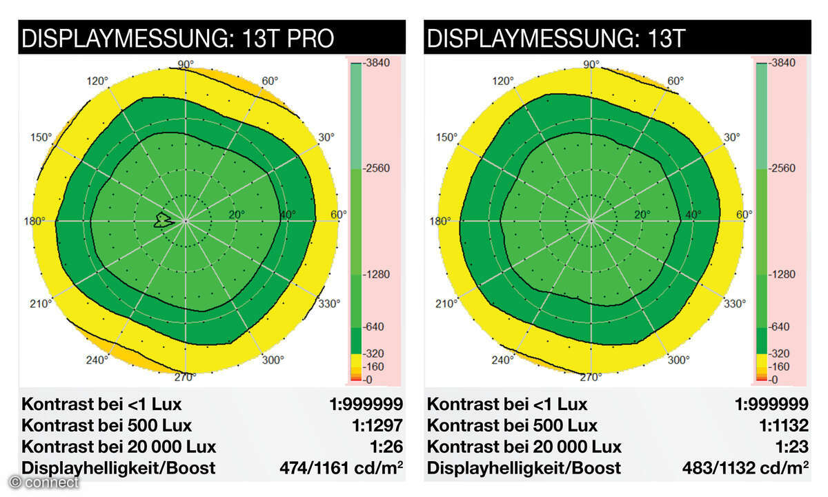 Nicht verwunderlich: Im Testlabor haben beide OLEDs ähnliche, sehr gute Messwerte. Mit einer Helligkeit von 474 Candela (13T Pro) und 483 Candela (13T) gehören die Displays im Alltag nicht zur leuchtstärksten Gruppe unter den Top-Phones. Eine maximale Helligkeit von 1.161 (13T Pro) und 1.132 Candela (13T) sichert bei Sonne trotzdem immer eine sehr gute Ablesbarkeit. Ansonsten könnten die Panels noch etwas blickwinkelstabiler sein.
