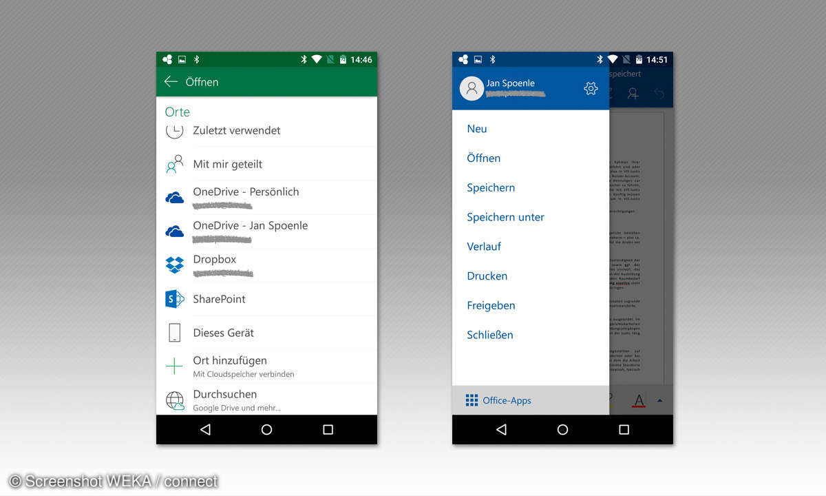 So ist es unabhängig vom Betriebssystem mit allen drei Office-Apps möglich, sowohl auf lokale Dateien als auch auf solche zuzugreifen, die bei Dropbox oder Onedrive gespeichert sind – beide Dienste sind eng eingebunden. Kleine Unterschiede zwischen der Android- und iOS-Version gibt es hingegen bei der Handhabung: Während sich Dokumente unter Android wie vom Rechner gewohnt mit „Speichern unter“ einfach woanders ablegen lassen, muss man für dasselbe Ergebnis unter iOS eine „Kopie speichern“. Stark ist die Einbindung der Document-Provider-Apps, mit der sich unter iOS Dokumente selbst dann öffnen lassen, wenn Sie in Dateimanagern wie Documents 5 oder Transmit oder in nicht direkt unterstützten Cloud-Diensten wie Google Drive gespeichert sind. Unter Android wird Google Drive ebenso wie der lokale Download-Ordner mit dem „Durchsuchen“-Befehl erreicht.