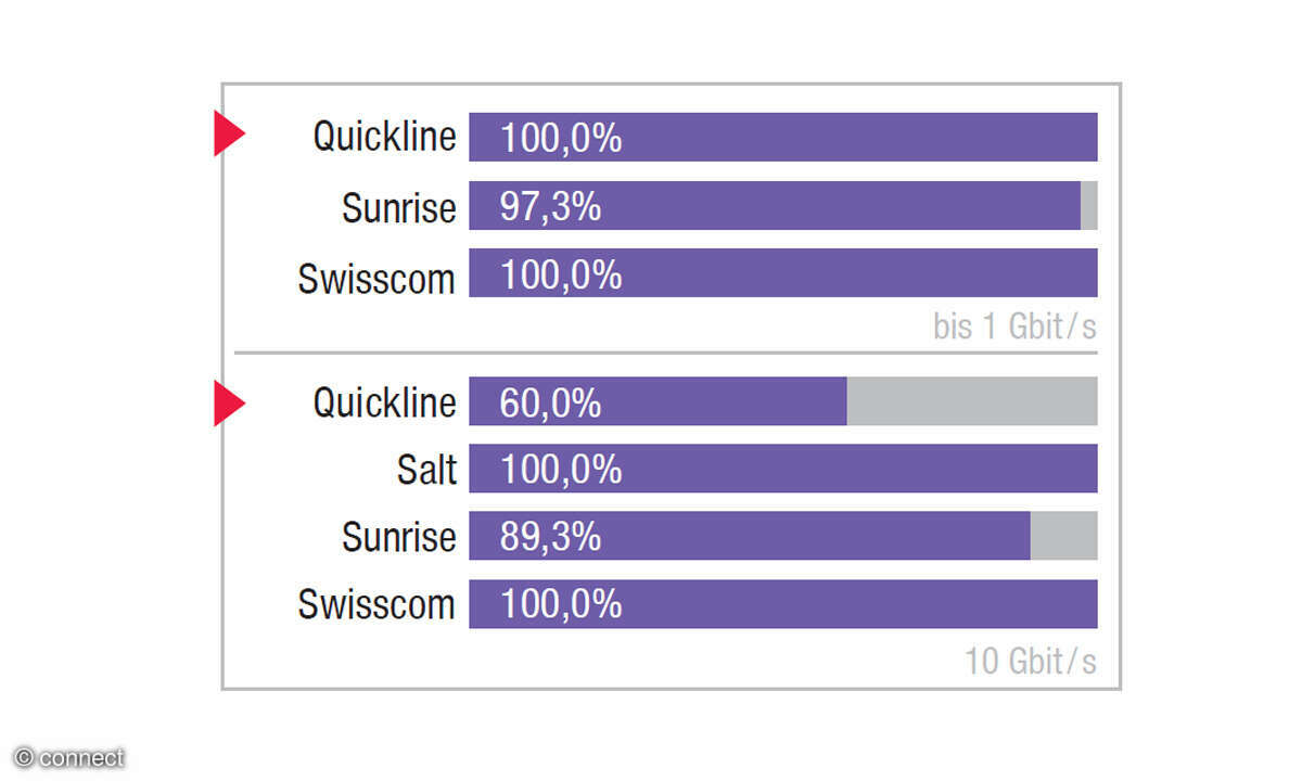 Schon in der Klasse bis 1 Gbit/s kann der Anbieter in allen getesteten Disziplinen überzeugen. Einige Highlights: überragende Leistungen bei den Highspeed-Internet-Tests, kürzeste DNS-Auflösungszeit, schnellste Gaming-Pings, beste VoIP-Sprachlaufzeiten und kürzeste Youtube-Antwortzeiten. Das Resultat hier: 30 Punkte Vorsprung vor Verfolger Quickline.
