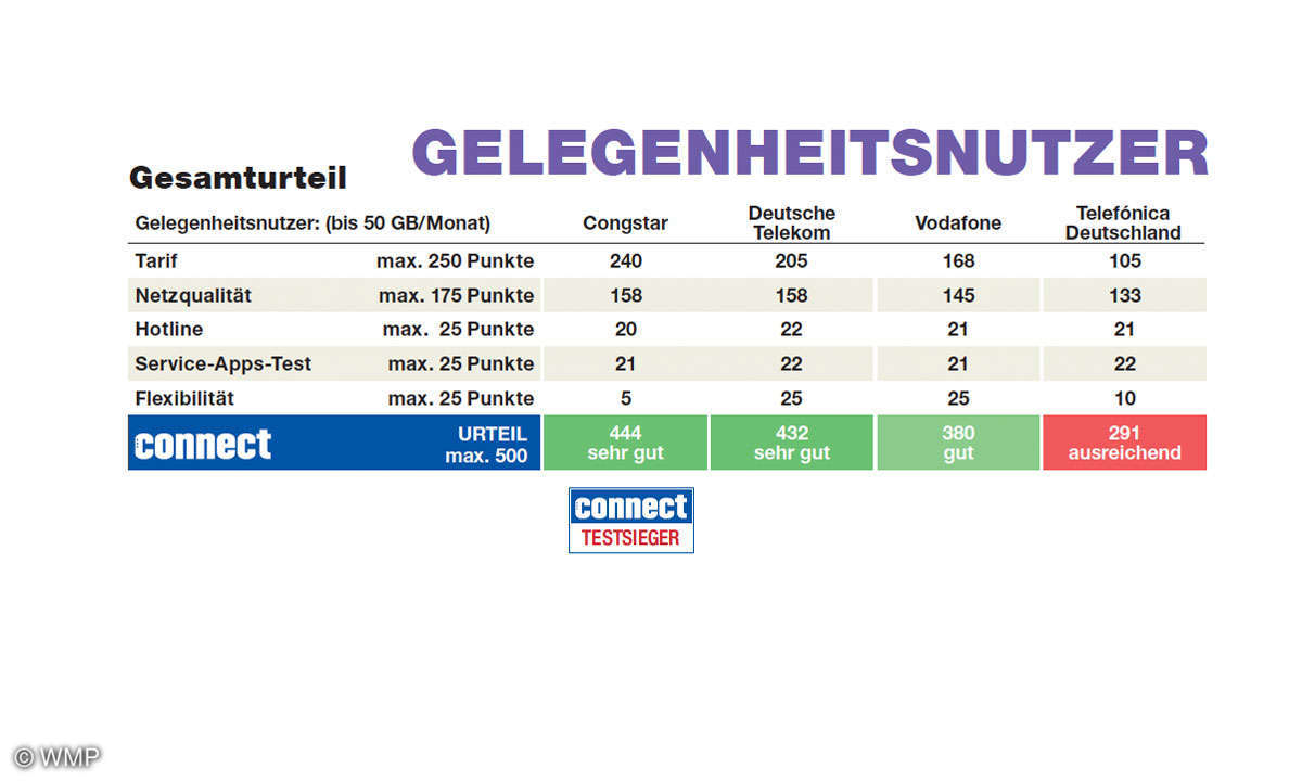 Hier liegen die Ergebnisse unseres letzten Hotline-Tests (connect 5/20 sowie des Service-App-Tests (connect 11/19) zugrunde. Beim Hotline-Test schnitt die Telekom mit „sehr gut“ ab und sicherte sich vor Vodafone und O2 den Sieg. Beim Shoptest errang O2 vor Vodafone und der Telekom den Sieg. Im Service-App-Test verwies die Telekom Telefónica und Vodafone auf die Plätze.