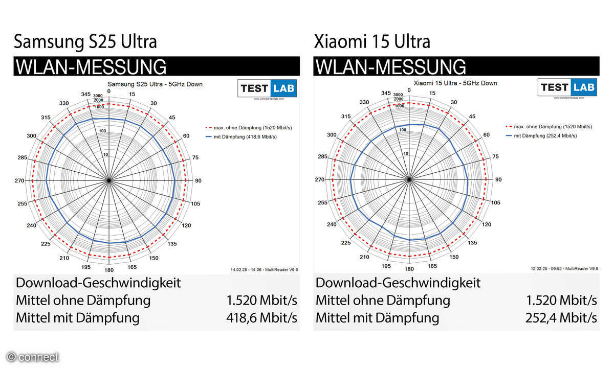 Bei den WLAN-Messungen im Testlabor werden ein paar Unterschiede zwischen den Geräten ersichtlich: So behält das Samsung Galaxy S25 Ultra beim Empfang durch Wände oder über größere Distanzen mit 418,6 Mbit/s einen deutlich höheren Durchsatz bei als das Xiaomi 15 Ultra mit 252,4 Mbit/s.