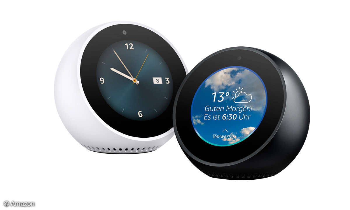 Der kleine Bruder der beiden Echo-Show-Geräte kombiniert die Vorteile eines Displays mit besonders kompakten Abmessungen, lässt sich also problemlos auf dem Nachttisch oder neben dem Fernseher aufstellen. Der runde, nur 2,5 Zoll große Bildschirm reduziert den Komfort der optischen Darstellung allerdings deutlich. Größtes Manko des Echo Spot ist jedoch sein schlichter Sound: Der nach hinten abstrahlende 36-mm-Lautsprecher klingt blechern, Bässe finden praktisch gar nicht statt. Immerhin kann man den smarten Radiowecker per Kabel oder Bluetooth mit vernünftigen Lautsprechern koppeln und so den Musikgenuss verbessern. Dank der integrierten Kamera, die sich zusammen mit den Mikrofonen deaktivieren lässt, kann man auch Videotelefonate führen, wobei das eigene Bild lediglich in VGA-Auflösung übertragen wird und so etwas pixelig wirkt.