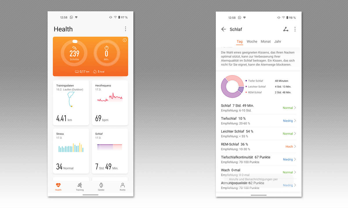 Die Huawei-Health-App bereitet alle erfassten Daten schlicht und übersichtlich auf und veranschaulicht sie mit einer Vielzahl vergrößerbarer Diagramme. Von der Sensorik hätten wir beim Schrittzähler noch konsistentere Werte erwartet.