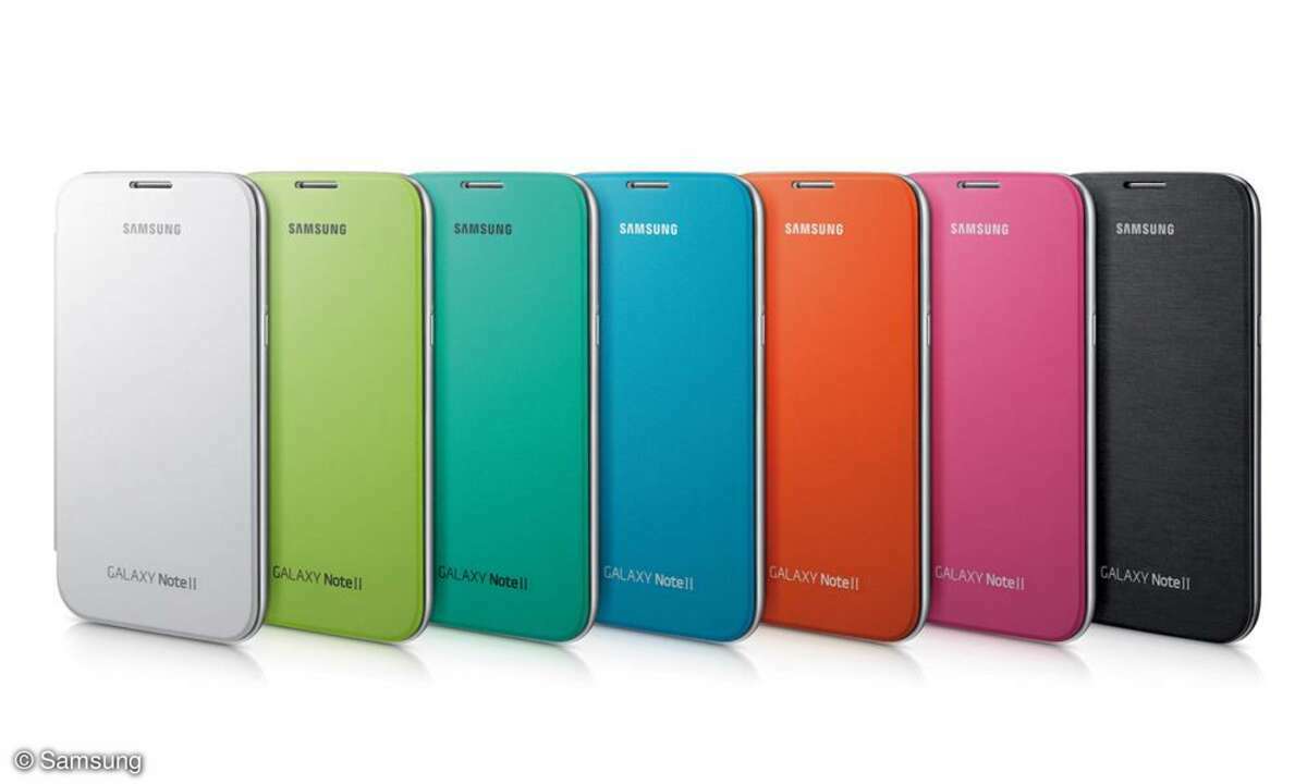 Das bei Galaxy-Note-Nutzern beliebte Flip-Cover ist auch für das Galaxy Note 2 in vielen Farben erhältlich. Das EFC-1J9F für 34,90 Euro gibt es gleich in sieben Farben - damit verpassen Sie Ihrem Galaxy Note 2 einen individuellen Look. Das Flip-Cover schützt auch das Display, und zwar mit seiner Innenseite aus Velours. Montiert ist es in Sekundenschnelle: Es wird einfach statt des serienmäßigen Akkudeckels aufgesetzt.